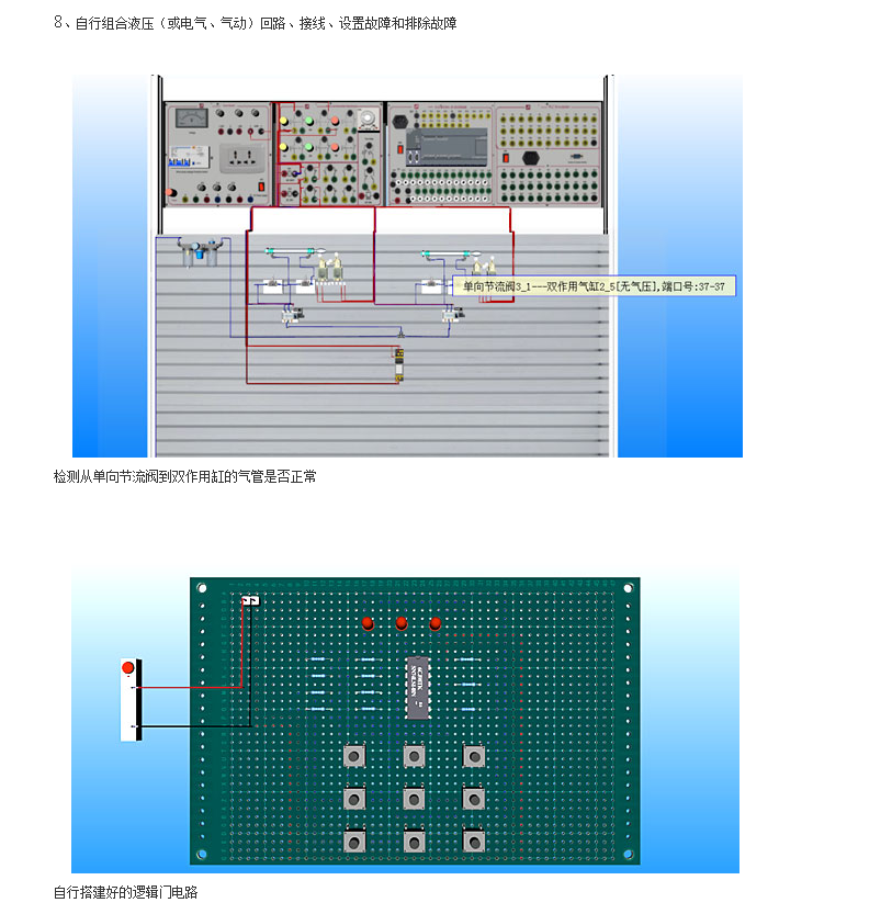 機(jī)電一體化系統(tǒng)主要將機(jī)械電路控制仿真系統(tǒng)、檢測(cè)系統(tǒng)、執(zhí)行系統(tǒng)集于一體。展示電、氣、液元件、典型機(jī)電設(shè)備的基本結(jié)構(gòu)及工作原理。實(shí)現(xiàn)了電、氣、液基本回路與傳感器、機(jī)械設(shè)備相結(jié)合的聯(lián)動(dòng)設(shè)備的安裝、調(diào)試、運(yùn)行與維護(hù)的功能,并部分采用可編程控制器來(lái)控制動(dòng)作過(guò)程。