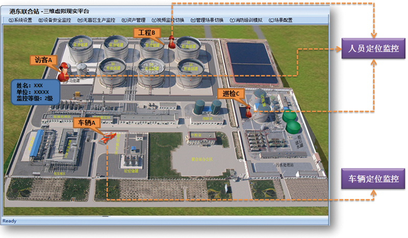 配合人員和車輛定位跟蹤系統(tǒng),在三維場(chǎng)景中實(shí)現(xiàn)無盲區(qū)跟蹤監(jiān)控管理。