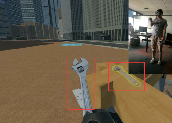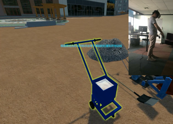 4.在場(chǎng)景中需要用到的工具會(huì)高亮顯示,學(xué)習(xí)這通過(guò)VR設(shè)備走到該工具處,通過(guò)VR設(shè)備拿起該設(shè)備,放到工具使用的位置,開(kāi)始施工。
