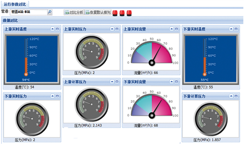 使用三維虛擬現(xiàn)實展示油田管網(wǎng)拓樸架構(gòu),在此基礎(chǔ)上實現(xiàn)了油氣管線狀態(tài)參數(shù)實時監(jiān)測。搭建了油氣管線數(shù)據(jù)開放平臺,在此基礎(chǔ)上可擴展其他應(yīng)用。通過對管線實時狀態(tài)參數(shù)的實測值和模擬計算的理論值對比分析,實現(xiàn)對管線的運行狀況多角度、全方位監(jiān)測,并通過預(yù)警、報警方法,實時監(jiān)測全管網(wǎng)的管線異常情況。